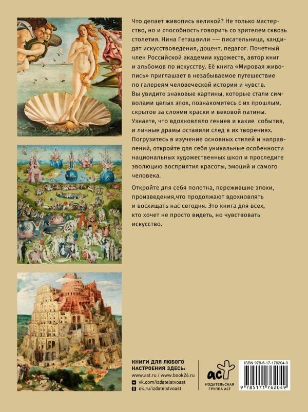 What makes a painting great? Not just skill, but also the ability to speak to the viewer across centuries. Nina Getashvili is a writer, PhD in art history, associate professor, and teacher. She is an honorary member of the Russian Academy of Arts and the author of books and albums on art. Her book, "World Painting," invites you on an unforgettable journey through the galleries of human history and emotion.