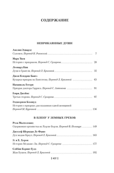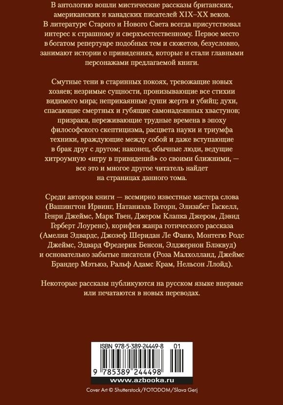 The anthology includes mystical stories by British, American and Canadian writers of the nineteenth and twentieth centuries. In the literature of the Old and New World, there has always been an interest in the macabre and the supernatural. The first place in the rich repertoire of such themes and plots is undoubtedly occupied by ghost stories, which are the main characters of the proposed book. Vague shadows in ancient chambers, disturbing the new owners, invisible entities that permeate all the elements of the visible world, the restless souls of victims and murderers, spirits that save mortals and ruin arrogant braggarts; ghosts going through difficult times in the era of philosophical skepticism, the flowering of science and the triumph of technology, feuding with each other and even marrying each other; finally, ordinary people, leading a cunning "game of ghosts" with their neighbors - all this and much more the reader will find in the pages of this volume.