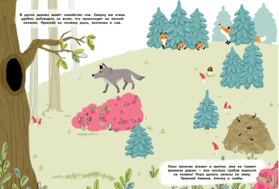 There are so many interesting things to see in the forest! Forest animals and birds live in burrows and dens, tree hollows and nests, lodges, and even just under a bush. Let's get to know them together. Turn the pages of the book and glue the pictures. And you can make up your own stories, because the stickers in the book are reusable, so you can stick them on again and again!