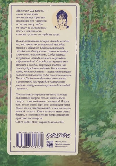 In a small house in Auvergne, far from the bustle of the city, Amanda finds what she sought after a tragic event: peace and solitude. Among the belongings of her previous owner, Madame Hugues, she discovers garden calendars with handwritten notes. Following advice from the past, Amanda begins to revive the neglected garden: sowing beds, growing flowers, and harvesting the first apples. With each blossoming bud, with each ripening fruit, hope awakens within her. Unexpected guests, local residents—new encounters also gradually fill her days with meaning and warmth. Melissa Da Costa, whose unique voice has captivated readers worldwide, has created a radiant story about the healing power of nature and human compassion, worth experiencing until the very last page.