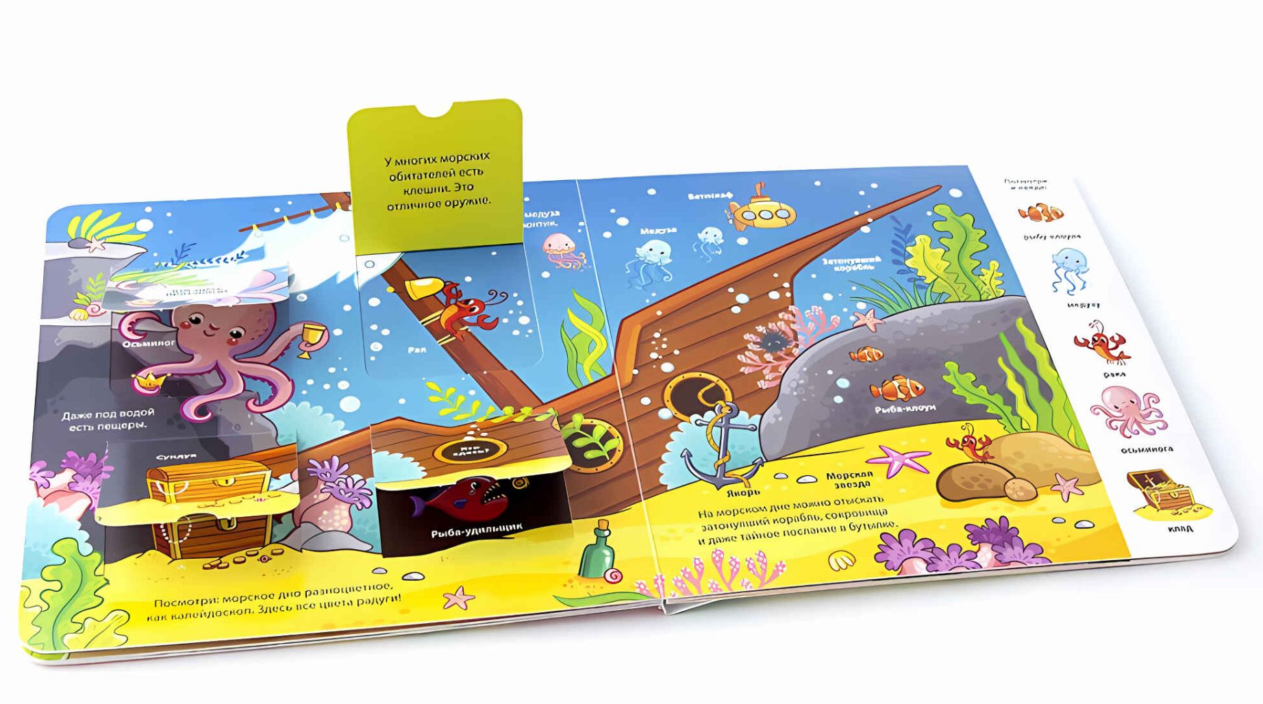 Open the magical windows and embark on a fascinating sea voyage. Meet the amazing inhabitants of the deep sea. Fun games await you on every page: learn to identify colors and shapes, count from one to five, and test your attentiveness!