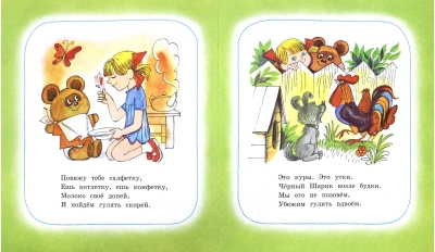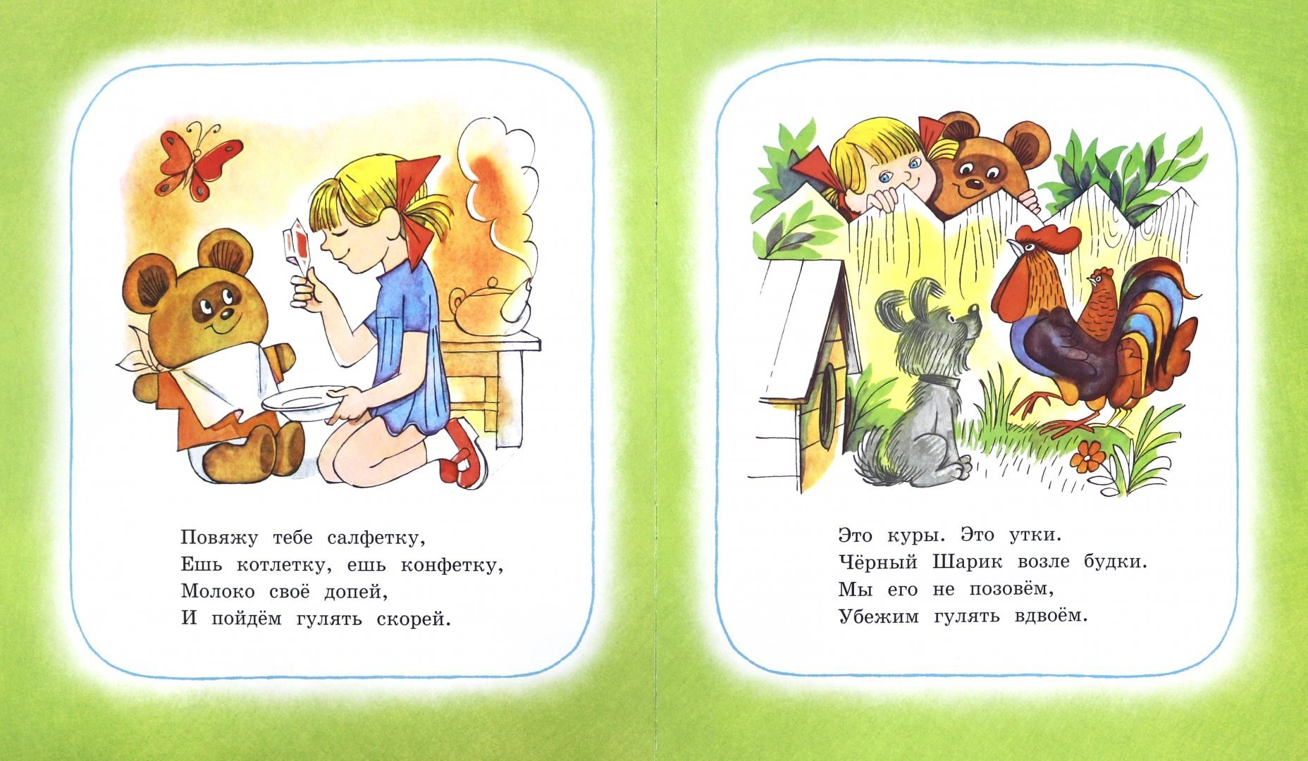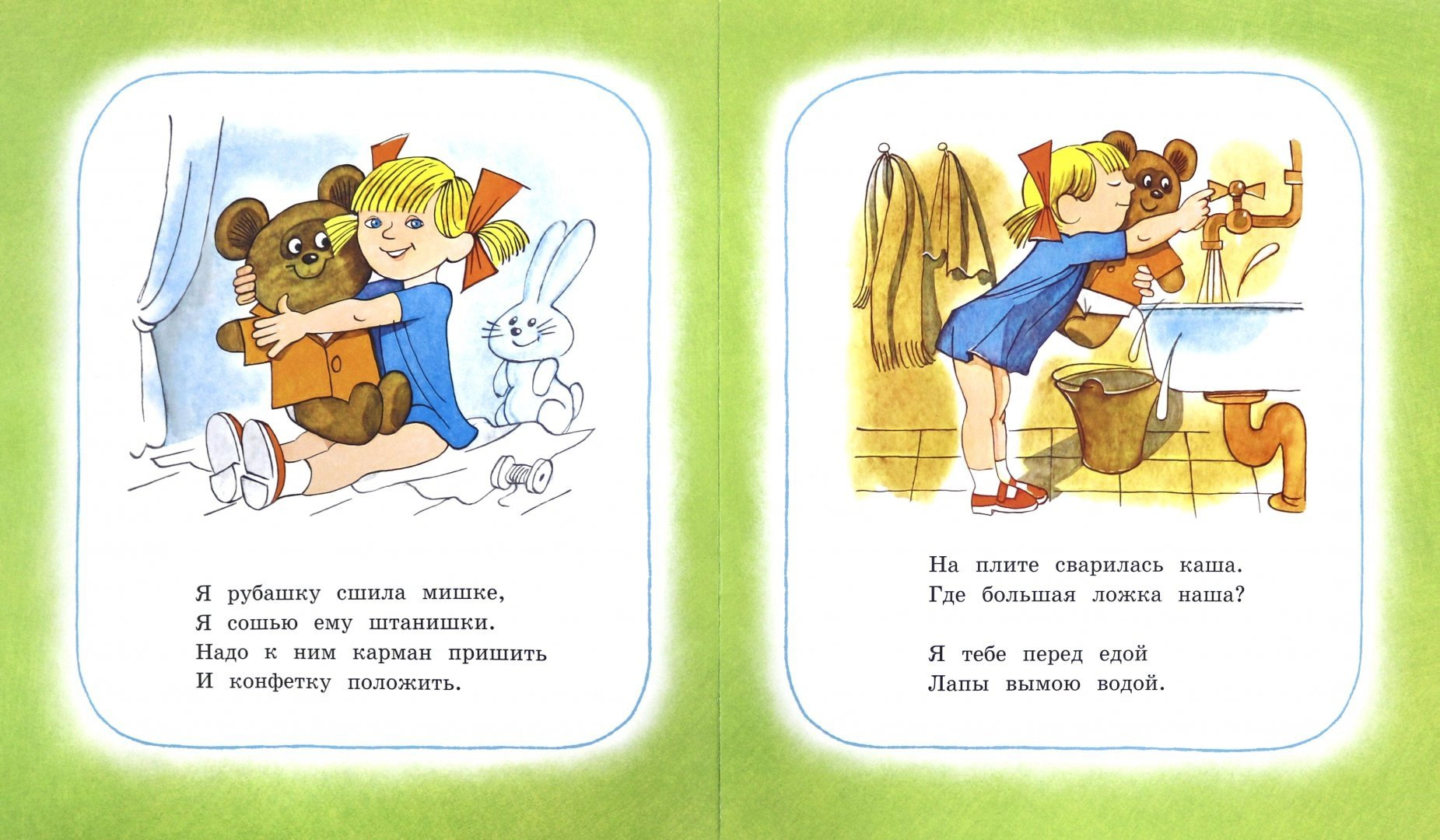The most famous children's poem by Zinaida Alexandrova in classic illustrations by Viktor Chizhikov! A girl plays with a teddy bear - sewing clothes for him, feeding him, walking with him in the yard. These simple poems are easy to remember and remain associated with childhood for a lifetime, just like these bright illustrations, and this touching teddy bear is a favorite toy of many generations of children.