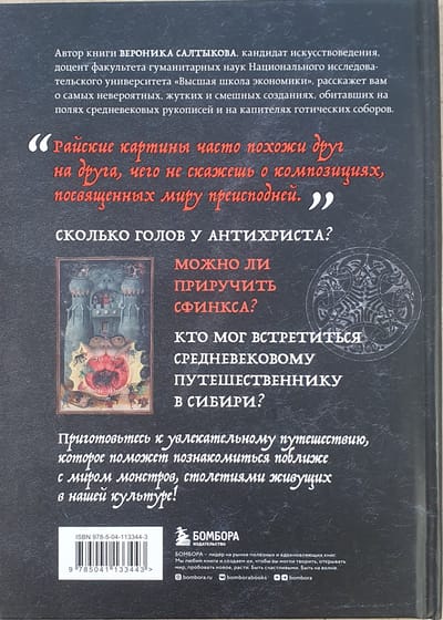 A frighteningly interesting exploration of the Middle Ages! "Monsters, Chimeras and Aliens in the Art of the Middle Ages" is a real treasure for all lovers of art and history. The author of the book, associate professor at the Higher School of Economics and talented art historian Veronika Saltykova, offers us to dive into the world of unique engravings and images that are full of scary and mysterious images of the time. How many heads does the Antichrist have? Can the sphinx be tamed? What are monsters born for? Find out the answers to these and many other questions by making a real journey into the past and uncovering the magic and mysteries of the Middle Ages!