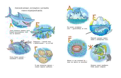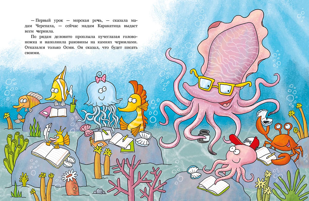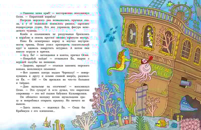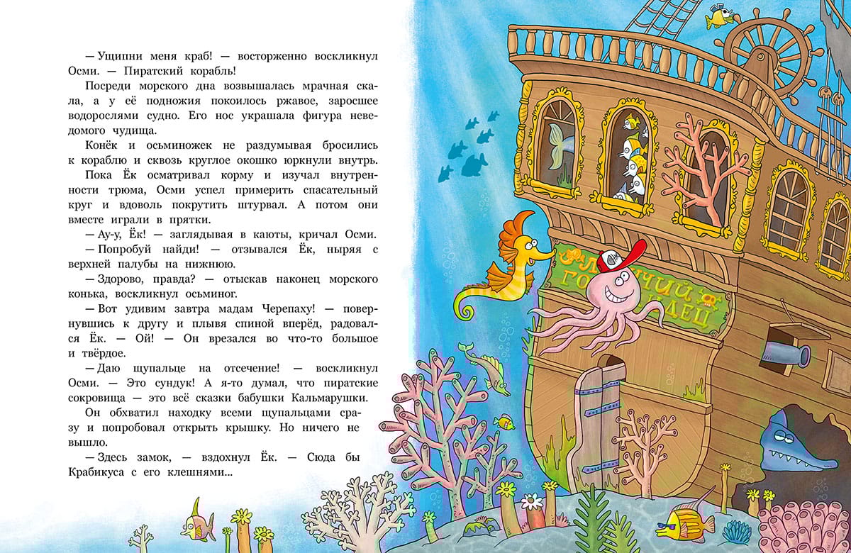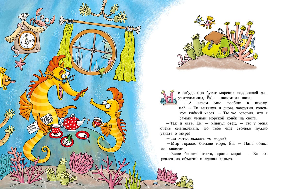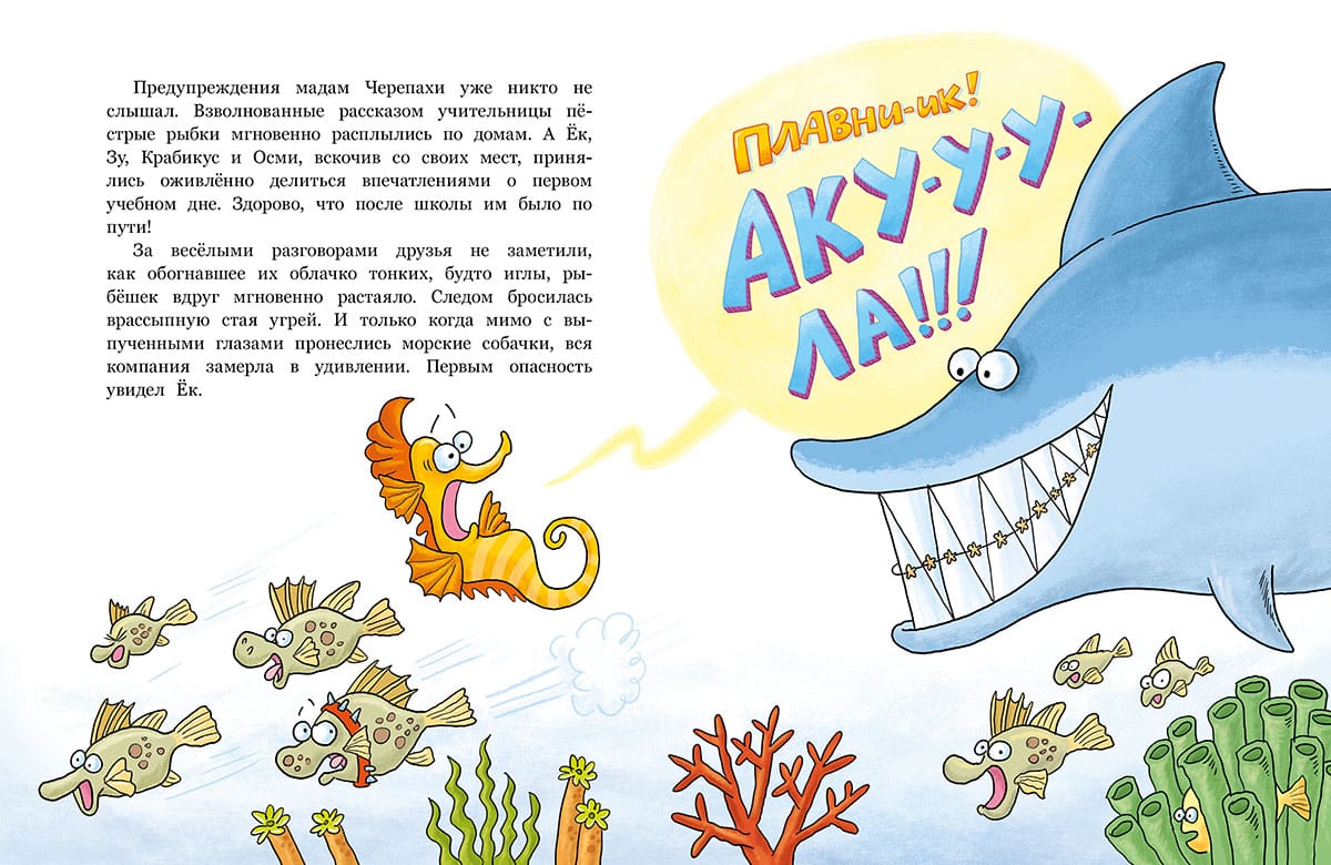 Little Yok is the smartest seahorse in the world! At least that's what his daddy thinks. But even the smartest seahorse has to go to school. However, Yok is not very happy about it, because for the first time he will have to leave his daddy for a long time... And anyway, can learning really be fun and interesting? Well, it can be! In the Underwater School Yok will learn how to read, write and count, get acquainted with the rules of behavior in the underwater world, and most importantly - will meet real friends. And, of course, it will not be without adventures, because "first graders" have a lot of curiosity! Read about how the seahorse Yok and the little octopus Osmi escaped from a shark, almost got caught in fishing nets and found a sunken pirate ship in the story by Julia Vesova with illustrations by the most cheerful artist Alexander Golubev.