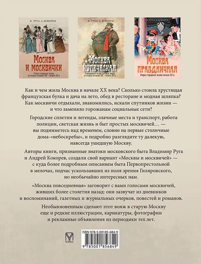 The book's authors, acknowledged experts on Moscow life, Vladimir Ruga and Andrei Kokorev, have created their own version of "Moscow and Muscovites"—with a much more detailed description of everyday life in the First Throne, detailing details that sometimes escaped Gilyarovsky's attention, but which are incredibly interesting to us. "Moscow Everyday" will speak to you in the voices of Muscovites who lived more than a century ago: they will emerge from diaries and memoirs, newspaper and magazine essays, short stories, and novels.