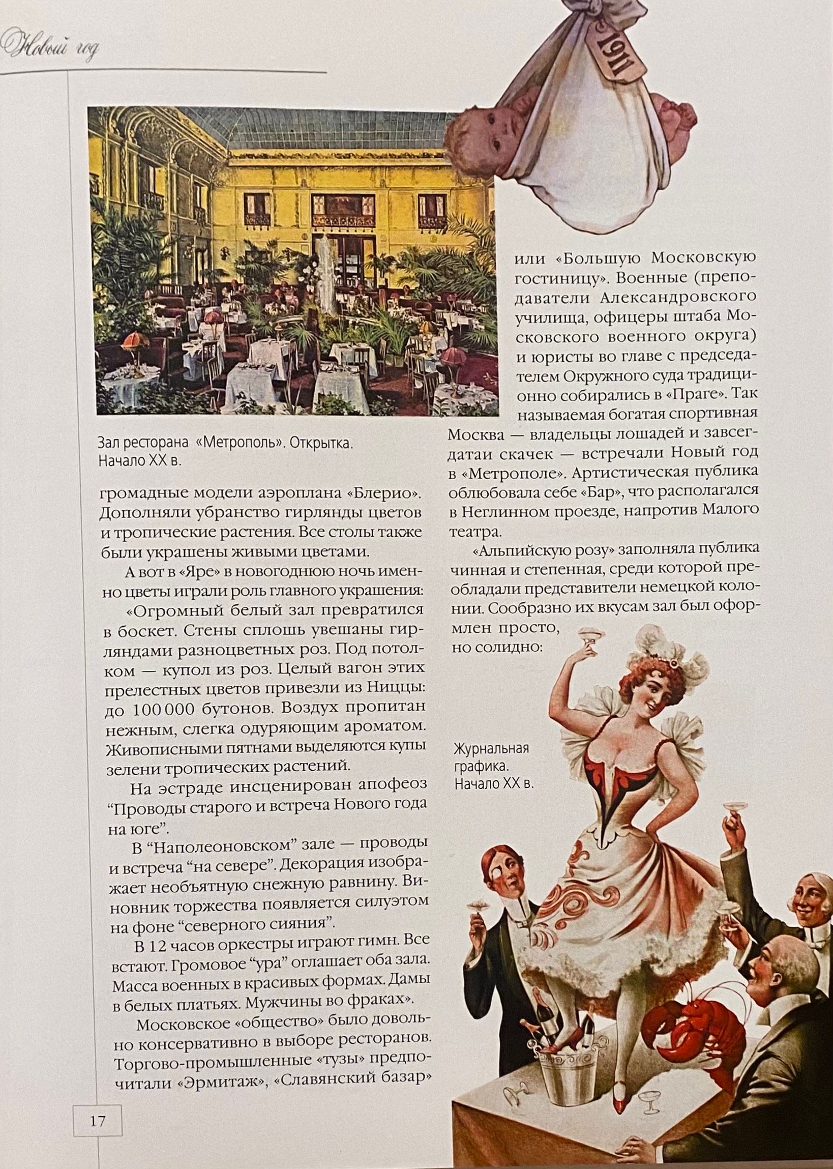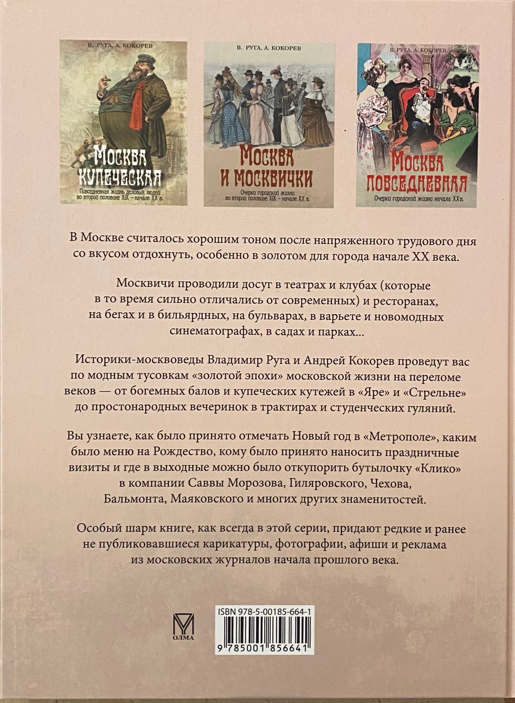 In Moscow, it was considered good form to relax in style after a hard day at work, especially in the golden age of the 20th century. Muscovites spent their leisure time in theaters and clubs (which at that time were very different from modern ones) and restaurants, at the racetrack and in billiard rooms, on the boulevards, in variety shows and new-fangled cinemas, in gardens and parks... Historians and Moscow experts Vladimir Ruga and Andrey Kokorev will take you through the fashionable hangouts of the "golden era" of Moscow life at the turn of the century - from bohemian balls and merchant revelries in "Yar" and "Strelna" to common parties in taverns and student festivities. You will learn how it was customary to celebrate the New Year at the Metropol, what the menu was like for Christmas, who it was customary to pay holiday visits to, and where on weekends you could uncork a bottle of Clicquot in the company of Savva Morozov, Gilyarovsky, Chekhov, Balmont, Mayakovsky, and many other celebrities.