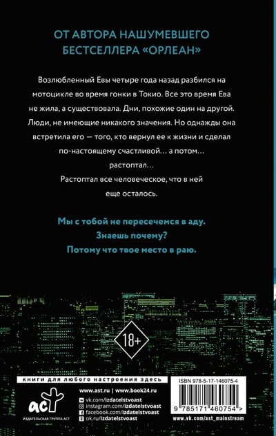 From the author of the acclaimed bestseller Orleans, Eva's lover of four years crashed his motorcycle during a race in Tokyo. All this time Eva did not live, but existed. Days similar to one another. People of no significance. But one day she met him - the one who brought her back to life and made her truly happy.... and then. trampled. Trampled everything human that was left in her. You and I will not cross paths in hell. You know why? Because you belong in heaven.
