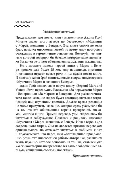 But in the XXI century, some of the advice is no longer relevant: the world has changed! What was salvation in the last century, today ceased to work. But all these years John Gray continued to work with couples, counseling, carefully studied the trends of the new world. Therefore, a fundamentally new version has appeared, which combines the discoveries of the first book and a new modern view of relationships. How exactly have men and women changed over the past twenty years? What actions and words provoke conflict in the modern family? How to keep attracted to each other for years to come? About this and much more in the new version of the legendary book!