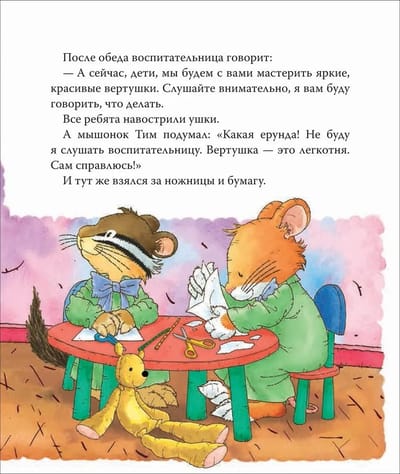A series of books about a funny and charming mouse Tim will help kids understand, recognize and name their feelings, learn to communicate with peers and cope with difficult situations. It seems to Tim the mouse that he is already quite big and does not need anyone's help. He can carry a heavy jug by himself, he can make a beautiful spinner by himself, he can get a pot from the top shelf by himself... But many things are difficult to do alone, and it doesn't matter whether you are big or not. Soon Tim the mouse will see that it is not shameful to ask for help.