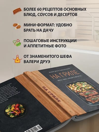 The book "On the Grill" is an indispensable assistant for all lovers of cooking on an open fire. It contains more than 60 recipes for meat, fish and seafood dishes, vegetables and even desserts cooked on the grill, plancha and barbecue grate. Step-by-step instructions, secrets of mastery and inspiring ideas will help you surprise your guests and enjoy a chic meal in the open air!