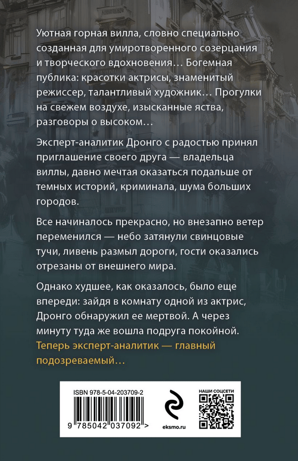 A cozy mountain villa, as if specially created for peaceful contemplation and creative inspiration... A bohemian audience: beautiful actresses, a famous director, a talented artist... Walks in the fresh air, exquisite meals, conversations about high things... Expert analyst Drongo gladly accepted the invitation of his friend - the owner of the villa, long dreaming to be away from dark stories, crime, the noise of big cities. Everything started perfectly, but suddenly the wind changed - the sky was covered with leaden clouds, the downpour washed out the roads, the guests were cut off from the outside world. However, the worst, as it turned out, was still ahead: going into the room of one of the actresses, Drongo found her dead. A minute later, a friend of the deceased entered the room. Now the expert-analyst is the main suspect....