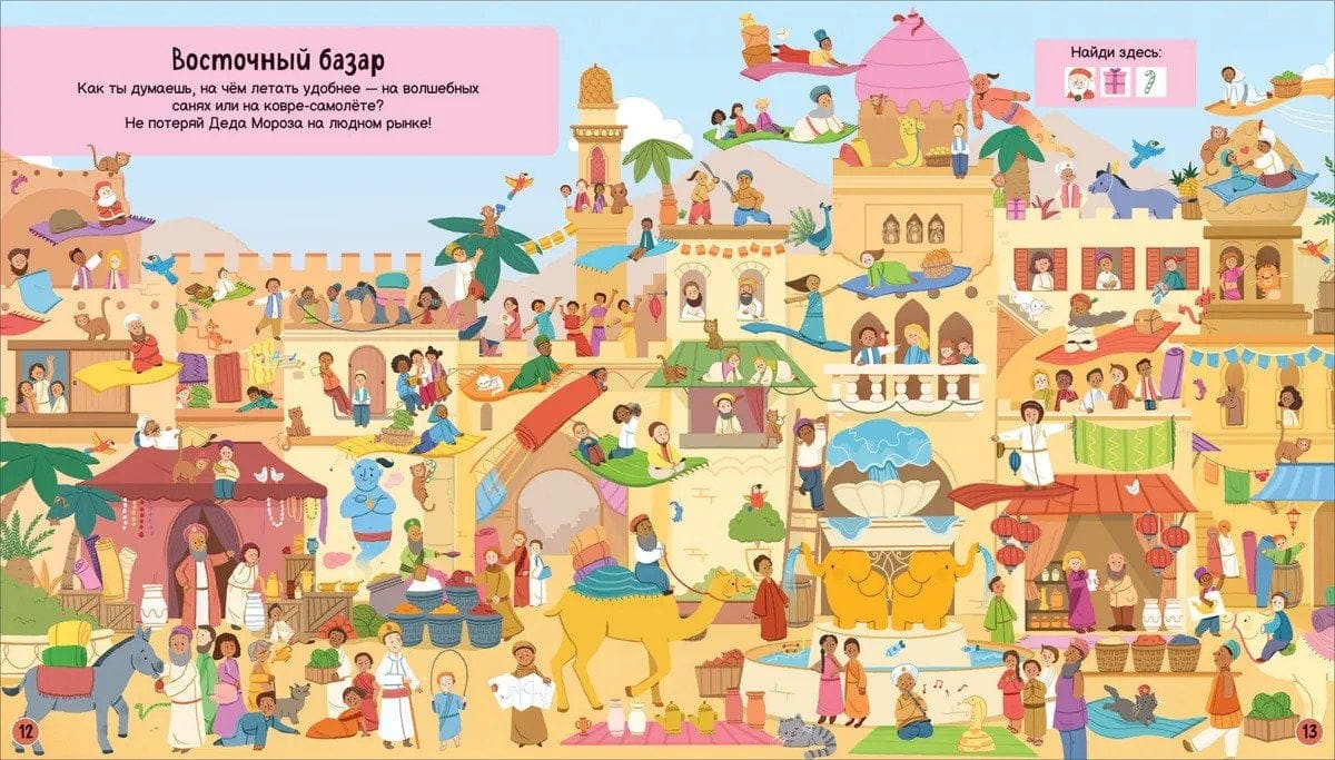 New Year is coming soon, and Santa Claus has a lot of troubles - he has to check who behaved well and who behaved badly, prepare presents and deliver them to children all over the world! Help the wizard to fulfill his mission - go with him on a trip around the world. Look at each spread, find the missing presents and enjoy the magical atmosphere of the holiday!
