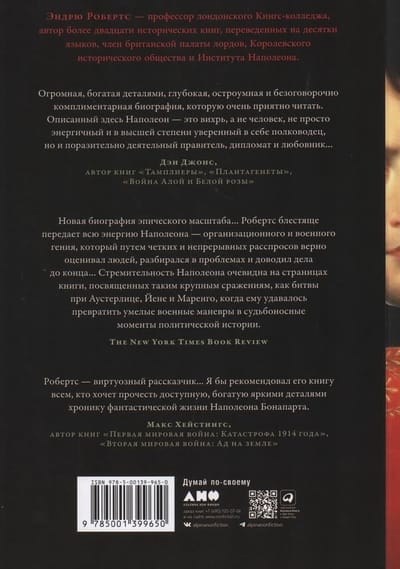 Andrew Roberts, a renowned British historian and biographer who is equally well versed in political and military history, has visited 53 of Napoleon's 60 battlefields, discovered vital new documents in the archives, and even made a long sea voyage to St. Helena. The result of all this work was a biography worthy of its hero: authoritative, insightful and beautifully written by an outstanding specialist.