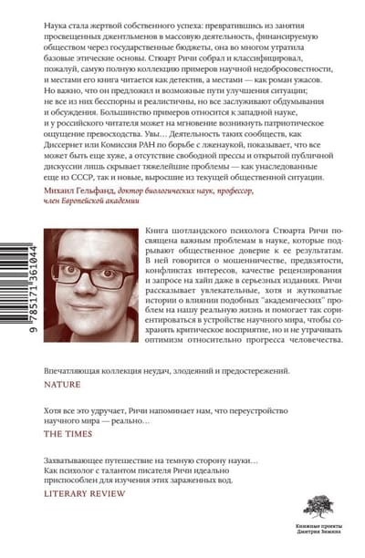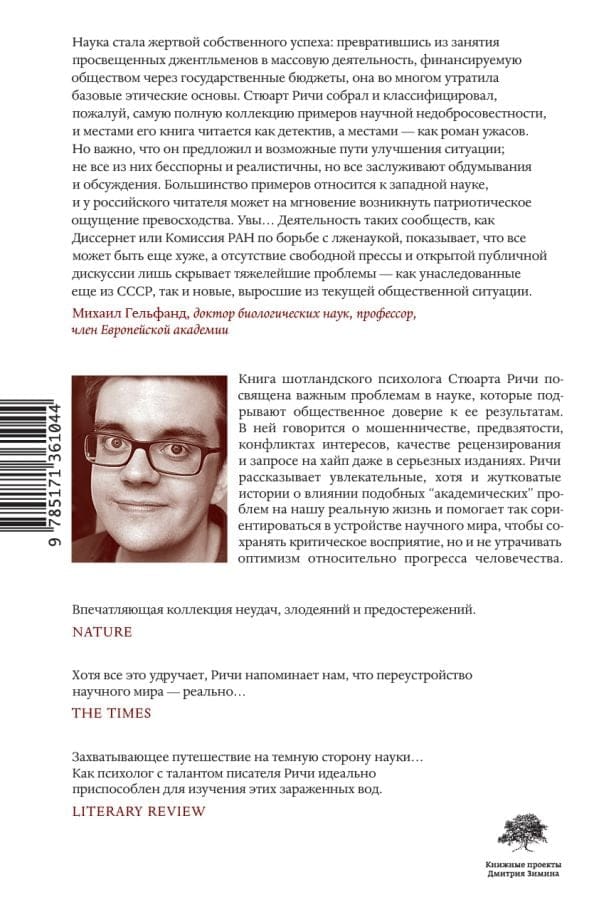 To define our worldview and make informed decisions that impact our lives, we need, among other things, to formulate our attitude toward expert opinions and the results of scientific research. "Scientists are lying and hiding everything," or "scientists have proven it, so it must be so"? Between these two extremes lies a vast field of ambiguity, and Stuart Ritchie's book helps us navigate it and find our own position. Using astonishing examples, Ritchie describes systemic problems in the public dissemination of scientific work and the structure of scientific activity itself, prompting us to critically rethink everything we've read, watched, and heard about science to date. However, this doesn't deprive us of hope for progress—on the contrary, we learn a great deal about what is being done and what more can be done to strengthen trust in the work of scientists on more reliable and sustainable foundations.