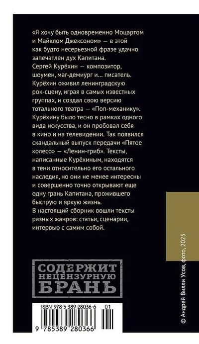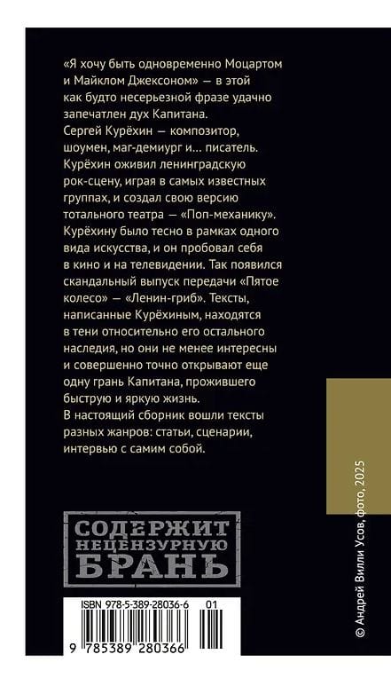 "I want to be both Mozart and Michael Jackson" - this seemingly frivolous phrase successfully captures the spirit of the Captain. Sergey Kuryokhin is a composer, showman, magician-demiurge and... a writer. Kuryokhin revived the Leningrad rock scene, playing in the most famous bands, and created his own version of total theater - "Pop Mechanics", where famous musicians, actors, hairdressers, animals participated equally. But even then, Kuryokhin felt cramped within the framework of one type of art, and he tried himself in film and television. This is how the scandalous episode of the program "Fifth Wheel" - "Lenin-mushroom" appeared, which later became a meme. The texts written by Kuryokhin are in the shadow of his other legacy, but they are no less interesting and definitely reveal another facet of the Captain, who lived a short and bright life. This collection includes texts of different genres: articles, scripts, interviews with himself.