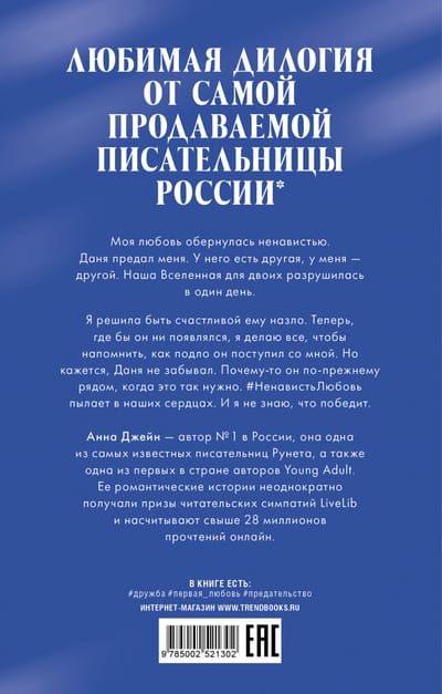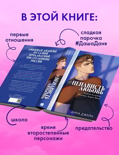 The novel "#HateLove" is a continuation of the popular dilogy by Anna Jane. The story of the sweet couple #DashaDanya gets a new development. The characters become older, their problems are more serious, and their feelings are brighter. With a new cover by Karina Yashagina and illustrations of important scenes from the novel, the dilogy will win the hearts of true book romantics and will become a decoration of your book collection.