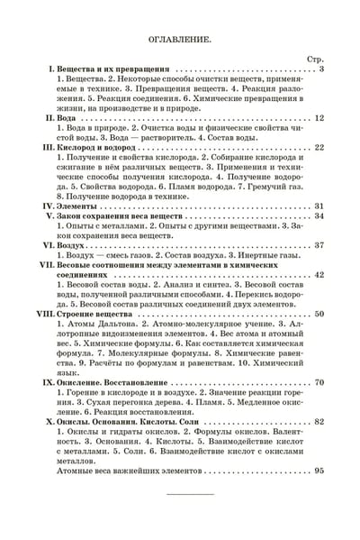 Soviet educational literature differs from modern editions not only in its systematic approach to the subject, but also in the accessibility of the presentation of the material. In terms of consistency of the logical scheme of the manual of the famous scientist-chemist Vadim Nikandrovich Verkhovsky has no equal, so it is still popular among teachers. The book is built on the principle of unity of theory and practice, great importance is given to practical laboratory and experimental work. The course of chemistry is built with orientation on the system of concepts of matter and gives students a complete range of systematized general knowledge. The first part of the book familiarizes students with the structure and transformations of substances, elements and their ratios in chemical compounds, as well as gives an idea of the law of conservation of weight of substances and redox reactions.
