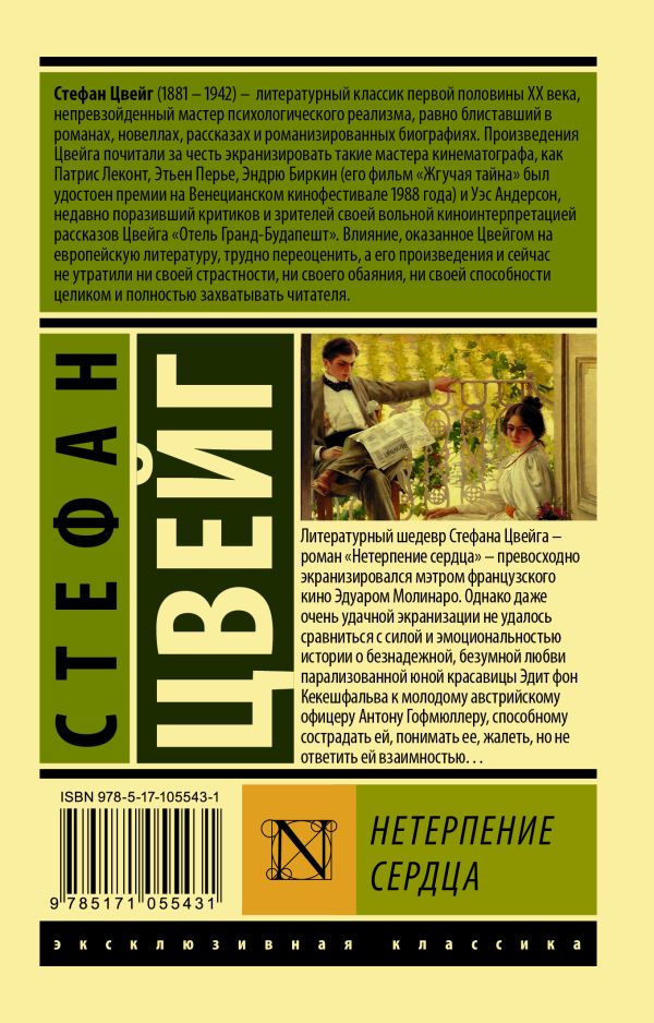 Stefan Zweig's literary masterpiece - the novel "The Impatience of the Heart" - was superbly screened by the maestro of French cinema Edouard Molinaro. However, even a very successful adaptation could not compare with the power and emotionality of the story about the hopeless, mad love of a paralyzed young beauty Edith von Kekeshfalva to a young Austrian officer Anton Hoffmuller, who is able to feel compassion for her, understand her, pity her, but not reciprocate her....