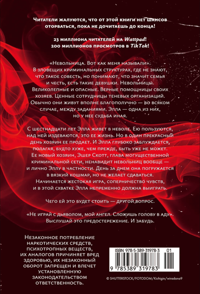 "A slave. That's what they called me." In sinister criminal structures, where they don't know the meaning of conscience, but understand the meaning of family and honor, there are such girls. Slaves. Magnificent and dangerous. Loyal assistants to their masters. Valuable employees of shadowy organizations. Usually, they live quite comfortably—at least between missions. Ella is one of them, but her fate is different. Since the age of sixteen, Ella has lived in captivity. She is used, abused, this is her life. But one day, her master sells her. And Ella is deeply mistaken, believing that things can't get any worse than before. Her new master, Asher Scott, the head of a powerful criminal network, hates slaves in general—and Ella in particular. Day after day, she plunges into a viscous nightmare, but she refuses to give in. A cruel game of emotions begins, a rivalry of emotions, and Ella must inevitably win this battle. The cost is another matter.