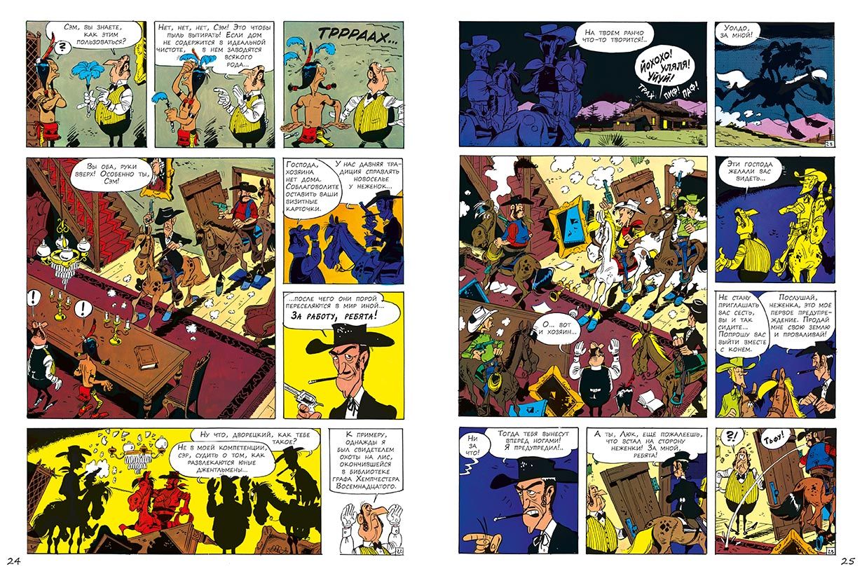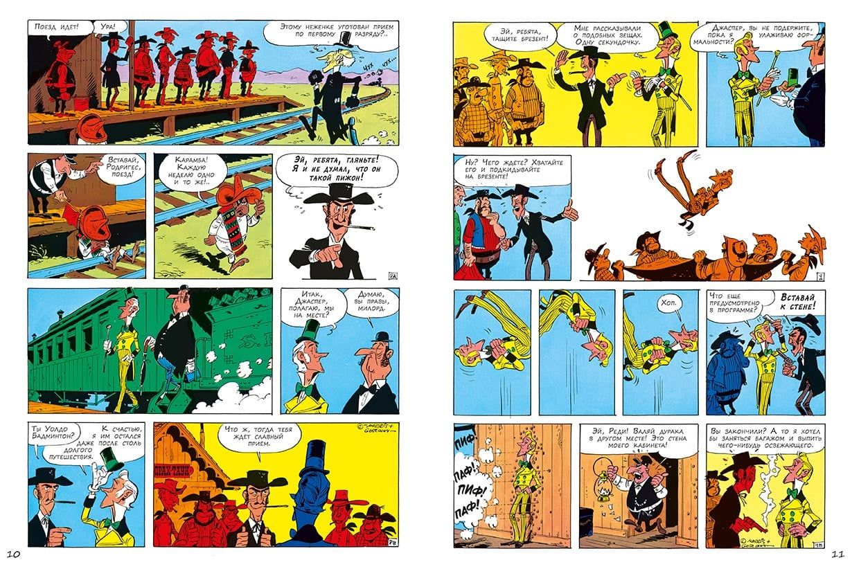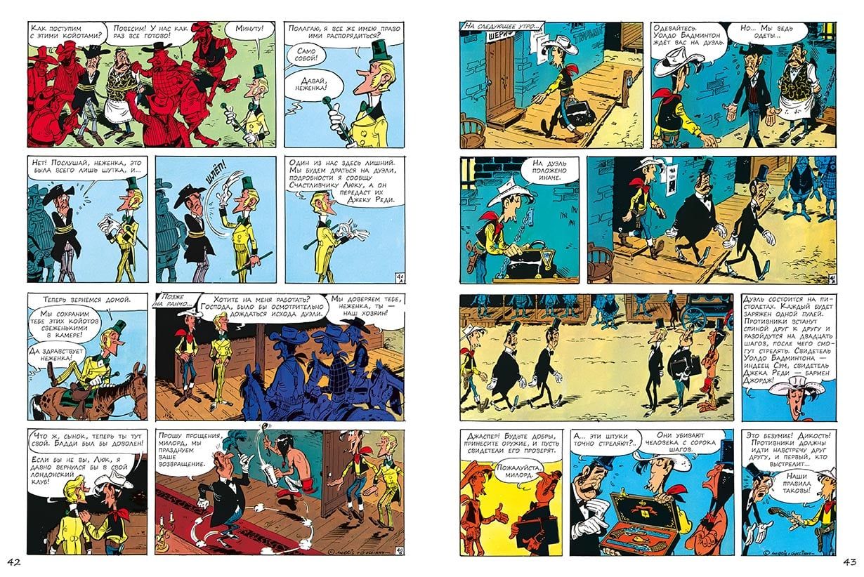 "Lucky Luke," along with "Tintin" and "Asterix," is one of the top three most popular Franco-Belgian comic books in the world. The total number of copies of books in the series has passed 300 million. "Lucky Luke" has already been translated into more than 25 languages, and finally appeared in Russian! Lucky Luke is a charming and fearless lonely cowboy of the times of the conquest of the American Wild West. He is a real hero, and even a superhero, honest and fair, defender of all the weak and helpless. He always stands on the side of the law, helping local authorities to resist bandits and other villains. Like a true superhero, he has his own superpower: to shoot faster than his own shadow! Each Lucky Luke story is a thrilling and highly educational comedy western that reflects the real events surrounding the exploration of the Wild West. In the ninth book of the series Lucky Luke will meet with very unusual guests of Texas: a young London aristocrat Waldo Badminton and his prim butler. The young refined Englishman, who inherited his great-uncle's ranch, will have to go from a novice to a real cowboy, and Lucky Luke will gladly help him in this. Lucky Luke comics are aimed at the widest possible audience. Both children and older readers will be delighted with the adventurous storyline, virtuoso cartoon drawing, good irony and humor in literally every frame. The humor, based, as a rule, on wordplay and principles of situation comedy, never falls below the belt. And despite the fact that the heroes now and then waving guns and making piffle, in these stories there is neither rudeness nor violence. The protagonist shoots, only to deftly knock the weapon out of the hands of opponents with a skillful shot. And the opponents, naturally, always miss. It is safe to say that not a single character is harmed in any story. Unless you count bruises and bumps, which periodically deservedly get negative heroes. Especially worth noting is the easy-to-read large print, thanks to which the comics about Lucky Luke will be suitable for beginning readers and will be the first step for them to read novels by Fenimore Cooper and Mein Reed. The creators of "Lucky Luke" - two brilliant humorists, the Belgian artist Maurice de Bever, who worked under the pseudonym Morris, and the Frenchman René Gosinny, well known to Russian readers for the cycle of stories "Little Nicolas" and the comics about Asterix, where he also acted as a scriptwriter.