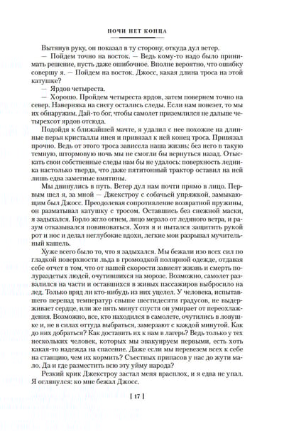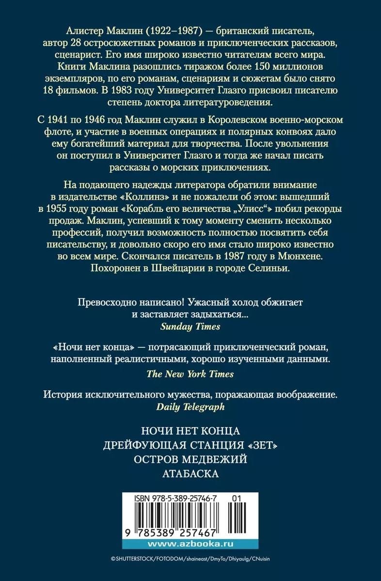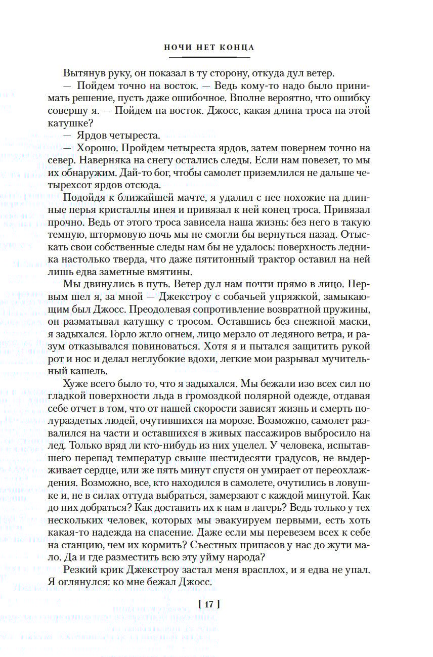 This collection is united by the theme of the Arctic, and opens with the novel "Night has no end". An airliner crashes in Greenland. Employees of the weather station rush to the aid of passengers, and the circumstances of the disaster suggest that among the survivors is a killer ... A distress signal is received from a polar station in the Arctic Ocean, and a nuclear submarine ("Drifting Station Zet") is sent to the area. In the course of the most complex rescue operation counts on hours ... A film crew is taken to a remote island in the Barents Sea, but the script remains a mystery to most ("Medvezhy Island"). During the voyage, several people suddenly die, and there is a suspicion that the choice of victims is not random... In the novel "Athabasca," the action takes place in Alaska. An oil company receives an anonymous threat of sabotage, but the investigation hits a dead end ...