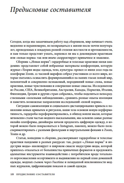 In 2020, the world faced a pandemic that mercilessly invaded all spheres of human activity. Prolonged lockdowns and forced virtualization of life have become a real challenge for the global community, giving rise to new attitudes and behavioral practices. How has the fashion industry responded to the new reality? How have the daily closet habits of each of us changed? How has the pandemic affected etiquette? What new aspects of the corporeal manifested themselves in a situation of restricted freedom? And how has the common medical mask been transformed into a cultural element? The authors of the articles included in this collection do not limit themselves to analyzing contemporary sartorial trends. They make historical excursions into the past and forecast the future, describe personal experiences of the lockdown, and document certain trends of the emerging "new normal. This book is a fascinating journey into a contemporary world in which fluidity, variability and unpredictability are at the forefront.