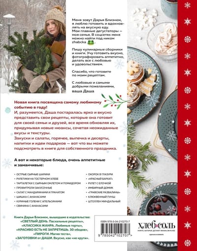 New design for a New Year's cookbook! Daria Bliznyuk, known on social media as zhabcka and the author of five cookbooks, dedicated this book to the most beloved event of the year and created a vibrant and delicious presentation of the New Year's recipes she prepares for her family and friends, constantly updating them, inventing new nuances, and combining unexpected flavors and textures. The recipes are described in detail and colorfully illustrated with the author's photos. Appetizers and salads, main courses, baked goods and desserts, drinks, and gift ideas—all of this is what you can find in the book for your own holiday.