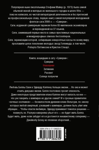 Bella is in constant danger. Even some members of the Cullen clan can attack her-what about vampires from other families? And the fearsome rulers of the "night hunters" - the ruthless ancient Volturi clan, whose law requires that any mortal who learns about vampires must be killed or turned... To save his beloved, Edward makes a hard decision: to leave her. The separation will surely kill him-but Bella will live. She will live, even if she forgets him and falls for her hated rival, Jacob Black of the werewolf tribe.