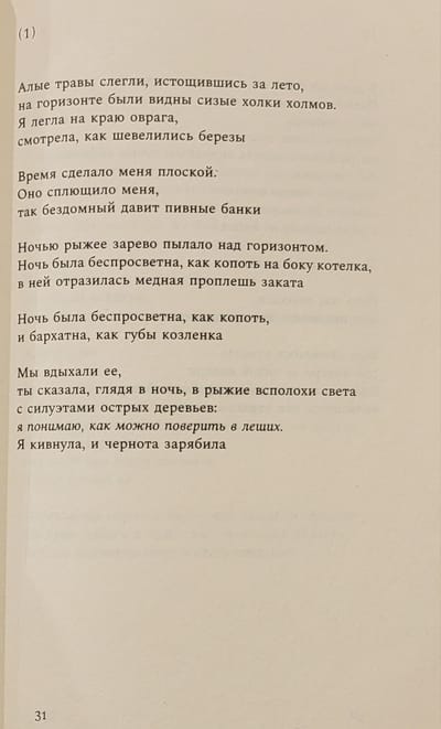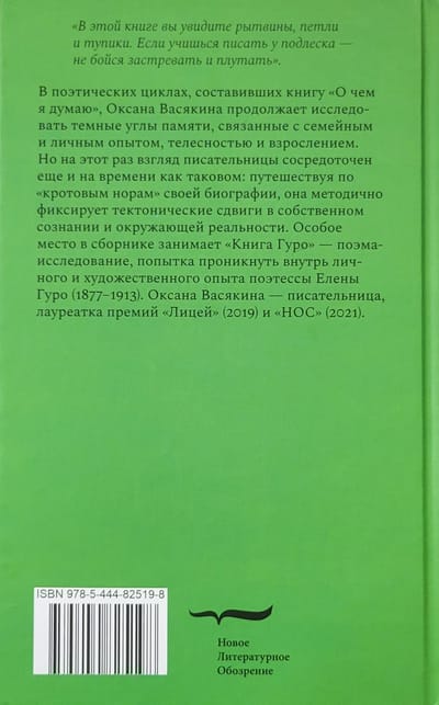 “In this book you will see pits, loops and dead ends. If you learn to write undergrowth, do not be afraid to get stuck and wander. In the poetic cycles that compiled the book What I Think About, Oksana Vasyakina continues to explore the dark corners of memory associated with family and personal experience, physicality and growing up. But this time the writer’s view is also focused on time itself: traveling through the “wormholes” of her biography, she methodically fixes tectonic shifts in her own consciousness and surrounding reality. A special place in the collection is occupied by the “Book of Gouro” – a poem-research, an attempt to penetrate the personal and artistic experience of the poetess Elena Guro (1877-1913). Oksana Vasyakina is a writer, winner of the Lyceum (2019) and NOS (2021).