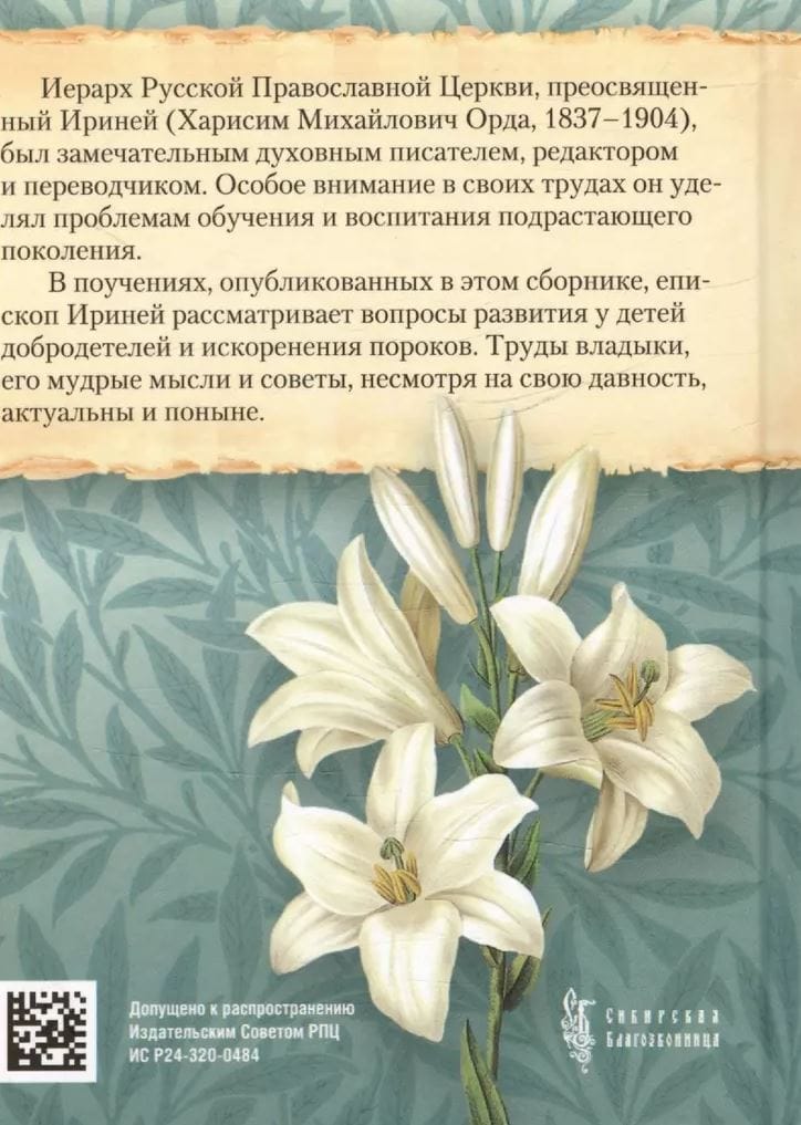 The hierarch of the Russian Orthodox Church, His Grace Ireneus (Kharisim Mikhailovich Orda), was a remarkable spiritual writer, editor and translator. In his works, he devoted special attention to the problems of teaching and educating the younger generation. In the teachings published in this collection, Bishop Ireneus examines the issues of developing virtues in children and eradicating vices. The works of the bishop, his wise thoughts and advice, despite their antiquity, are still relevant today.