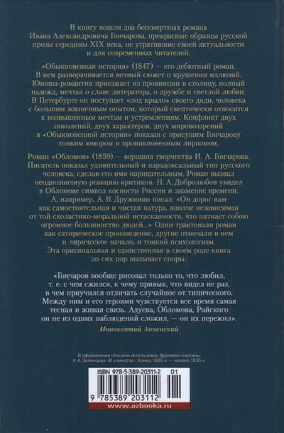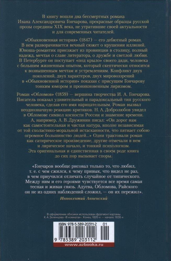 The book includes two immortal novels by Ivan Alexandrovich Goncharov, one of the classics of Russian literature. "Ordinary History" (1847) - his debut novel. It unfolds the eternal plot of the collapse of illusions. A young romantic boy comes from the provinces to the capital, full of hope, dreaming of literary fame, friendship and bright love. In St. Petersburg he comes "under the wing" of his uncle, a man of great life experience, who is skeptical of lofty dreams and aspirations. The conflict of two generations, two characters, two worldviews in "An Ordinary Story" is shown with Goncharov's inherent subtle humor and heartfelt lyricism. The novel "Oblomov" (1859) - the pinnacle of creativity IA Goncharov. The writer showed an amazing and paradoxical type of Russian man, making his name a nominal. The novel caused mixed reactions from critics. N. A. Dobrolyubov saw in Oblomov a symbol of the obliquity of Russia and a sign of the times. And, for example, AV Druzhinin wrote: "He is dear to us as an independent and pure nature, quite independent of that scholastic-moral istaskanchnosti that stains the vast majority of people ..." Some interpreted the novel as a satirical work, others noted in it and lyrical beginning, and subtle psychology. This original and one-of-a-kind book is still controversial. "Each of the characters created by Goncharov, - a perfect generalization of human nature," - noted D. S. Merezhkovsky. Goncharov's novels are wonderful examples of Russian prose of the mid-19th century, which have not lost their relevance for modern readers.