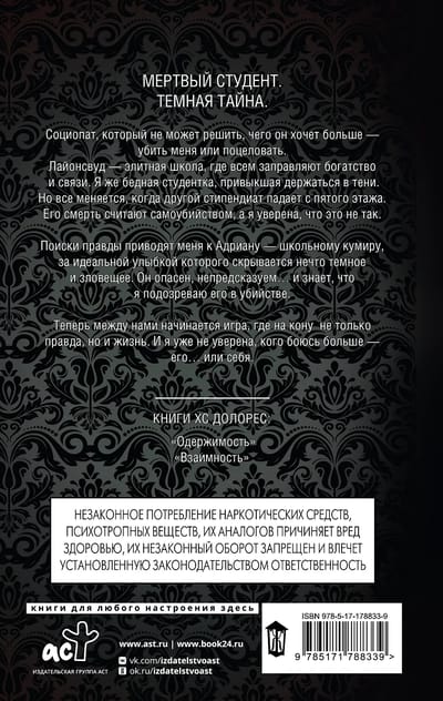 My search for the truth leads me to Adrian, the school idol, whose perfect smile conceals something dark and sinister. He's dangerous, unpredictable... and he knows I suspect him of murder.