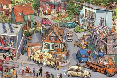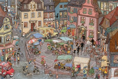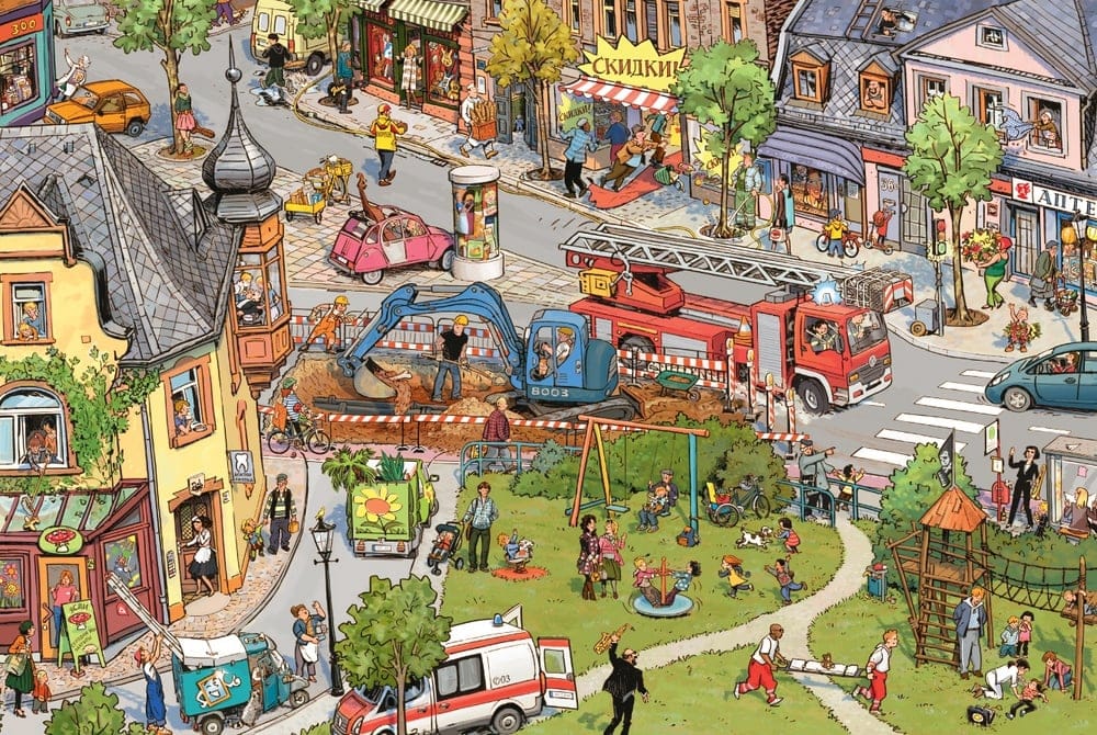 The book continues the "children's silent movie" series by German artists Doro Göbel and Peter Knorr. The earlier books in the series are "Out of Town" (2012) and "In the Circus" (2012). This time the action of the book unfolds on the streets of a small modern town. On 7 spreads readers will have to live one exciting, eventful day - from morning until the evening. There are about two dozen main characters in the book, who must be found on each spread and trace how the day turned out. And that's not counting the other numerous inhabitants of the town, with whom something happens on every page. On the pages of the book you can find representatives of more than 60 professions! There is a veterinarian, a baker, a glass washer, a waitress, a florist, a dentist, mechanics, musicians, cab drivers, salesmen, builders, lifeguards, and so on. Adults can discuss with the child what people do in this or that profession, and at the same time ask what their young reader wants to become in the future. Looking at the book, children will learn to see and notice details, trace logical connections between events, independently compose a story based on pictures. In addition to the fact that this book is informative and, of course, developing, it will be able and just laugh, and give a good mood for both children and adults, because the artists did not skimp on jokes and funny moments. For example, the voracious raccoon, who tries to steal food from the window cleaner, the construction worker, or the vegetable seller, cannot but cause a smile. And a witty story with a mammoth bone, found by an excavator during road works and after many adventures found its place in the city museum. There are so many story lines in the book that it is impossible to follow them all at once. They intertwine, intersect, happen simultaneously, as in a real movie - and as in real life!