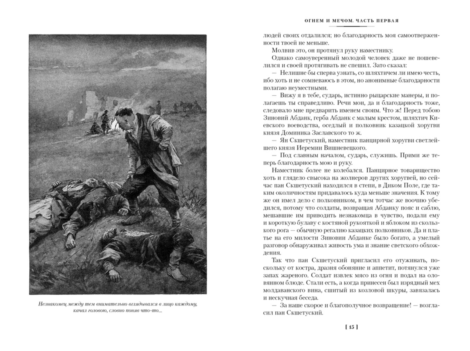 A classic of Polish literature and an honorary academician of the St. Petersburg Academy of Sciences, Henryk Sienkiewicz was a brilliant historical novelist. Like Hugo, Dumas, and Tolstoy, he was able to depict the great events of bygone eras while also focusing on the individual who created them. In 1905, Sienkiewicz was awarded the Nobel Prize in Literature "for outstanding achievements in the field of epic poetry." His novel, "With Fire and Sword," recounts the dramatic events of the 17th-century Ukraine, during the popular uprising led by Bohdan Khmelnytsky, which led to the reunification of Ukraine and Russia. It is a captivating tale of harsh times, courageous individuals, vibrant characters, and exceptional destinies. This Russian edition, for the first time, features the novel's text accompanied by brilliant illustrations by the Czech artist Wenceslas Černý.
