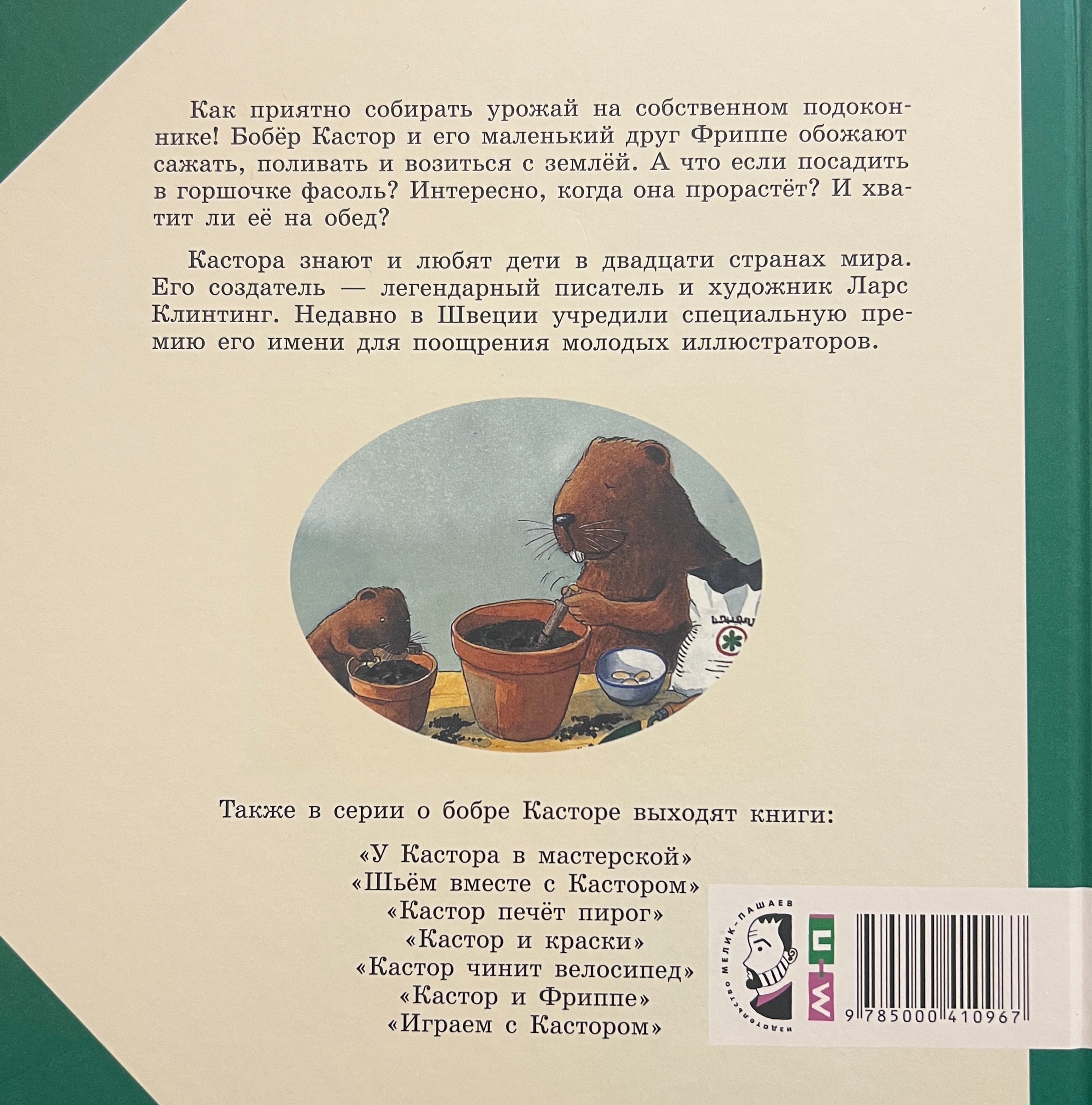 In the book "Castor's Garden", the tireless beaver Castor and his friend Frippe grow beans on a windowsill. They take a few white beans from a regular store package, soak them overnight, plant them in a pot with soil, water them regularly - and in just over a week the first sprouts appear! Each stage of the process is illustrated and described in detail, so if you follow Castor's advice exactly, you can easily grow wonderful beans on your own windowsill, and one day cook them for dinner. The book is perfect for creative leisure with children aged 3-6. Beaver Castor is known and loved by children in twenty-five countries around the world. His creator is the legendary Swedish children's writer and illustrator Lars Klinting, winner of many international awards.