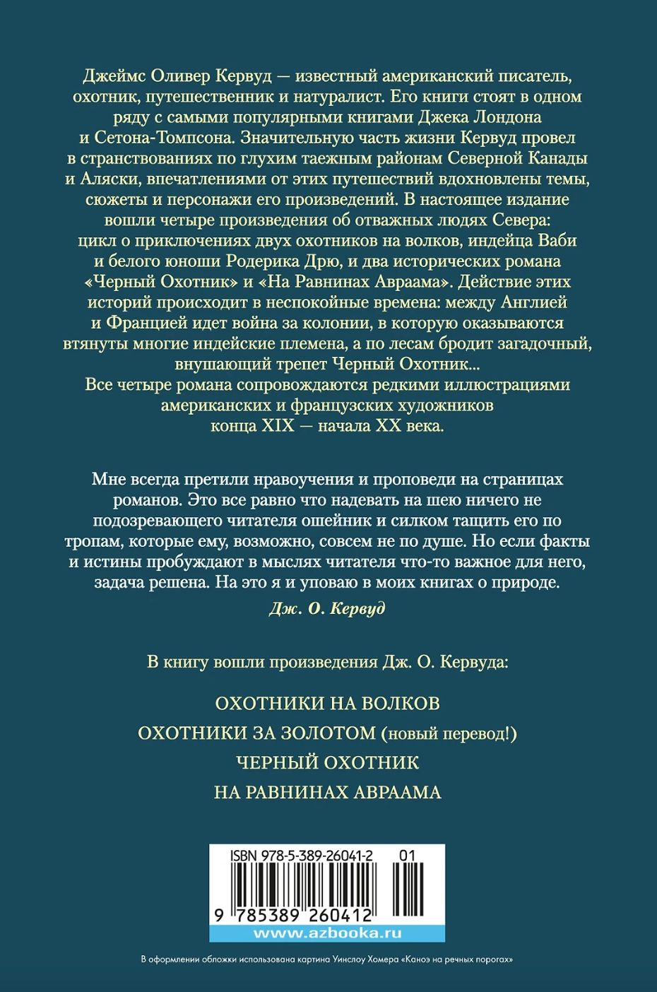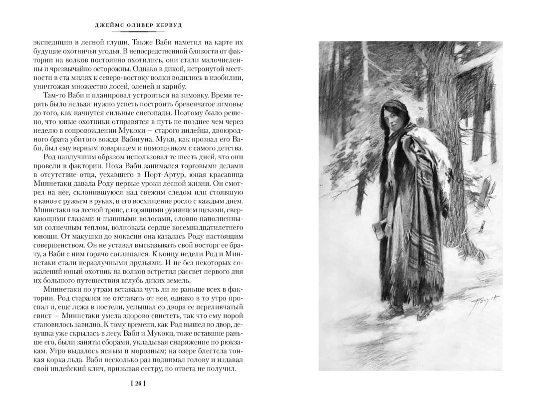 James Oliver Curwood is a famous American writer, hunter, traveler and naturalist. His books are on a par with the most popular books by Jack London and Seton-Thompson. Curwood spent a significant part of his life wandering through the remote taiga regions of Northern Canada and Alaska, and the themes, plots and characters of his works are inspired by his impressions of these travels. This edition includes four works about brave people of the North: a cycle about the adventures of two wolf hunters, the Indian Wabi and the white youth Roderick Drew, and two historical novels, The Black Hunter and On the Plains of Abraham. The action of these stories takes place in turbulent times: there is a war between England and France for colonies, in which many Indian tribes find themselves drawn, and a mysterious, awe-inspiring Black Hunter roams the forests... All four novels are accompanied by rare illustrations by American and French artists of the late 19th - early 20th centuries.
