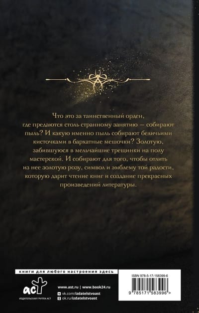 What is this mysterious order, where they indulge in such a strange occupation - collecting dust? And what kind of dust do they collect with squirrel tassels in velvet bags? The gold dust that is embedded in the smallest cracks in the floor of the workshop. And they collect it in order to cast a golden rose, a symbol and emblem of the joy that comes from reading books and creating beautiful works of literature.