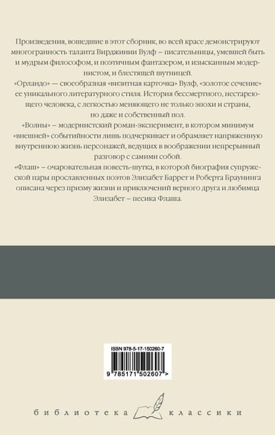 The works included in this collection, in all their glory demonstrates the versatility of Virginia Woolf's talent - a writer who could be a wise philosopher, and poetic fantasist, and a refined modernist, and brilliant jokester. "Orlando" - a kind of "calling card" Wolfe, "golden section" of her unique literary style. The story of immortal, ageless man, with ease changing not only eras and countries, but even his own sex. "Waves" - a modernist novel-experiment, in which a minimum of "external" events only emphasizes and frames the intense inner life of the characters, leading in the imagination of a continuous conversation with themselves. "Flush" - a charming story-joke, in which the biography of a married couple of famous poets Elizabeth Barrett and Robert Browning is described through the prism of life and adventures of Elizabeth's faithful friend and favorite dog Flush.