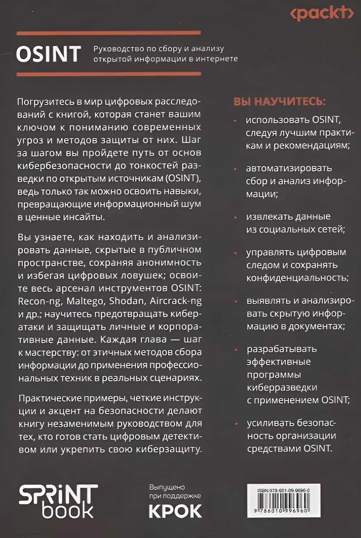 You will learn how to find and analyze data hidden in the public space, maintaining anonymity and avoiding digital traps; master the entire arsenal of OSINT tools: Recon-ng, Maltego, Shodan, Aircrack-ng, etc.; learn how to prevent cyberattacks and protect personal and corporate data. Each chapter is a step towards mastery: from ethical methods of collecting information to the use of professional techniques in real-life scenarios.