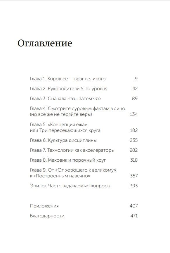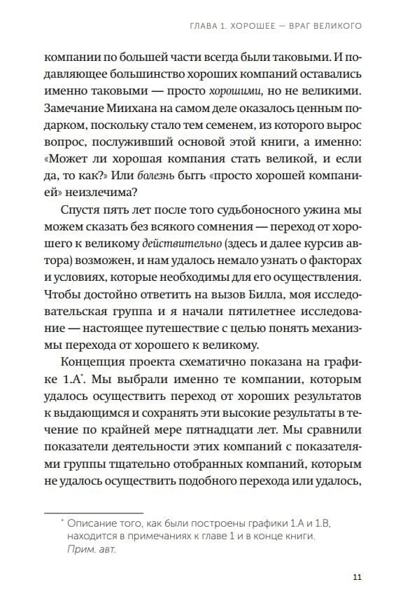 The book analyzes the experience of companies that have made the transition from good to outstanding, such as: Abbott, Circuit City, Fannie Mae, Gillette, Kimberly-Clark, Kroger, Nucor, Philip Morris, Pitney Bowes, Walgreens, Wells Fargo. These companies maintained high results for 15 years. Thus, by 2000, an investment of $ 1 made in 1965 in these companies would have increased 471 times, and investments in shares of all companies on the market would have increased only 56 times. The research team led by Jim Collins examines the factors and conditions necessary for the transition "from good to great" and its mechanisms. The authors are convinced that consistent implementation of the ideas and concepts outlined in the book will help almost any organization radically improve its activities and achieve truly outstanding results.