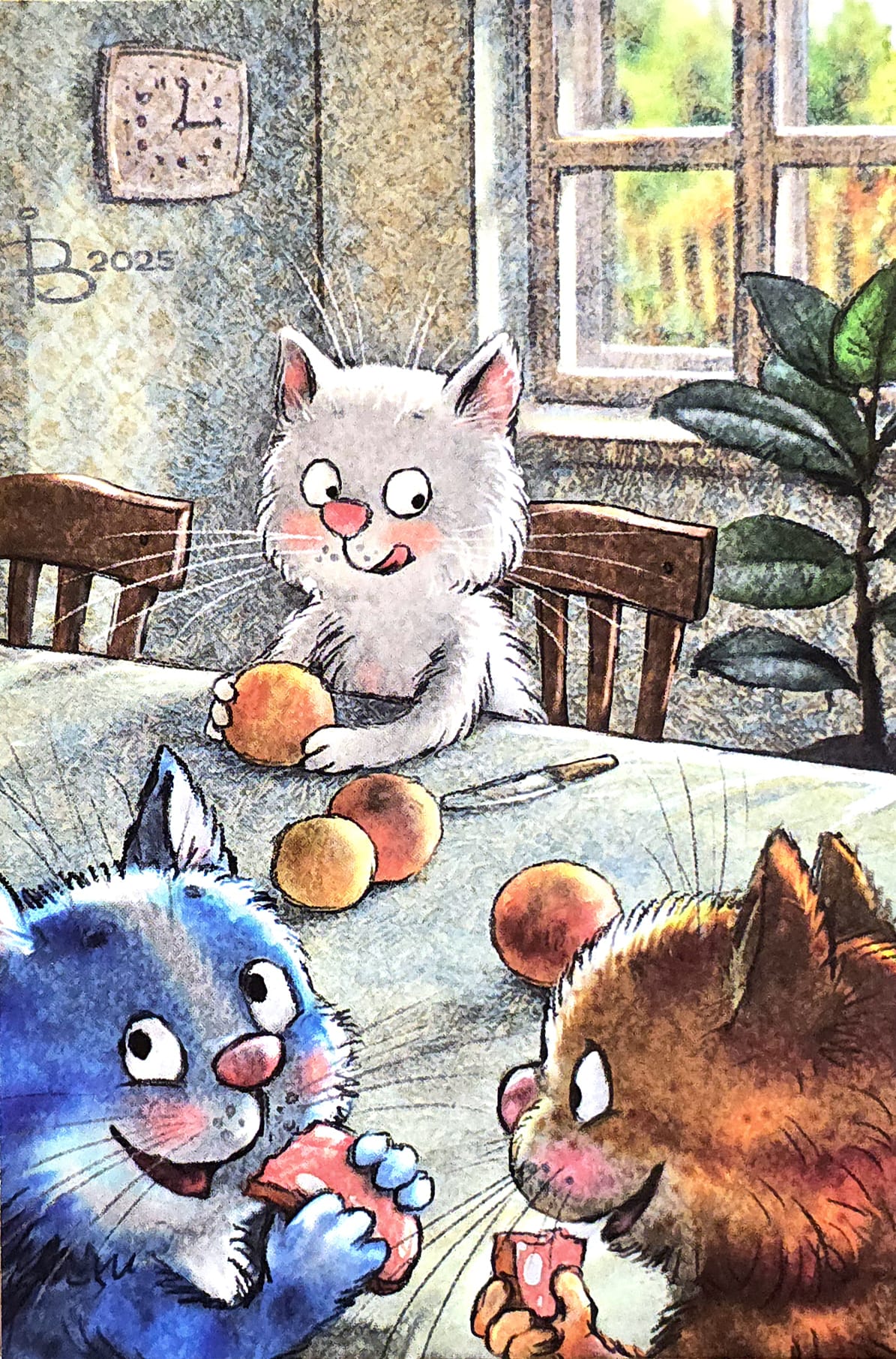 Postcard. Blue Cats. Girl with Peaches.