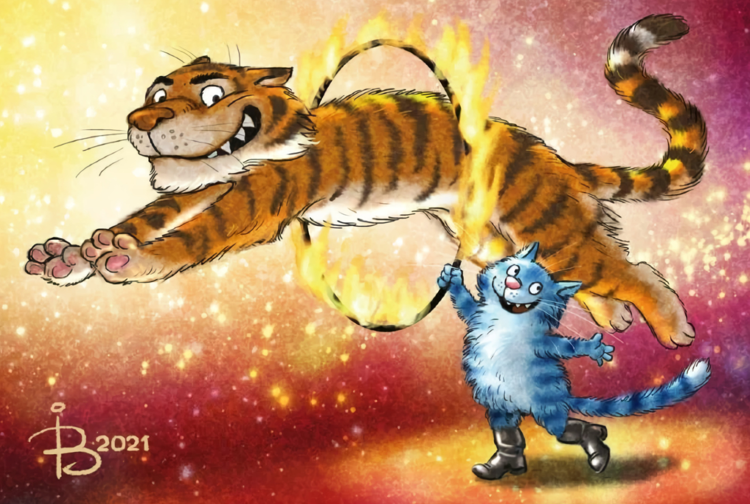 Postcard. Blue cats. Tiger.