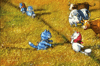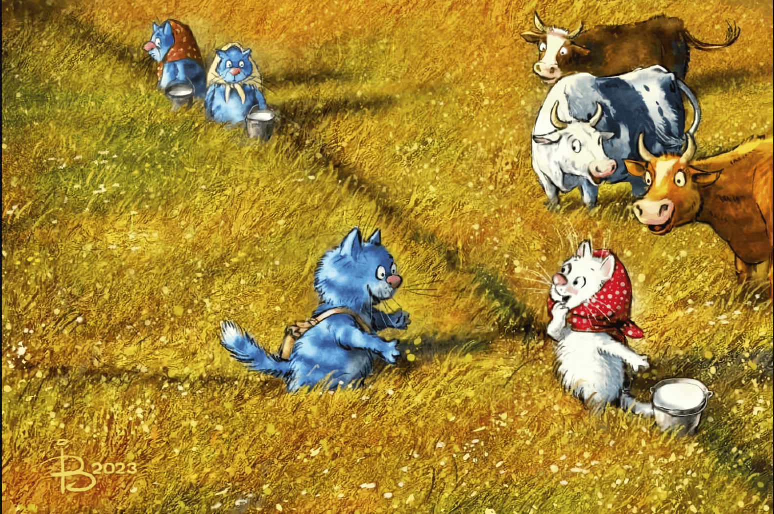 Postcard. Blue cats. Meeting in the meadow.