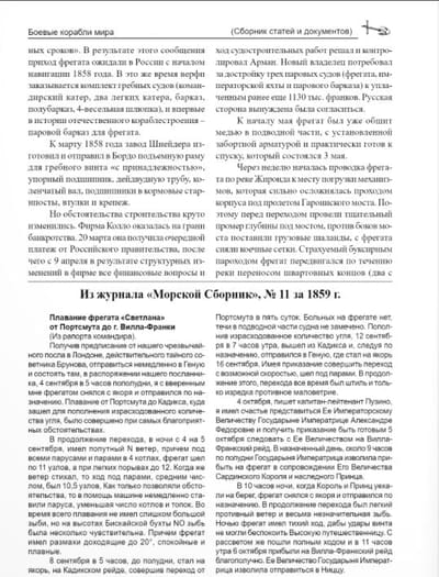 In the second part, the story of the sailing-screw frigates of the Russian Empire continues. At the end of the Crimean War, in order to renew the fleet as soon as possible by steam ships of a new generation, the frigates Peresvet and Oleg were laid down in Arkhangelsk and St. Petersburg, and the latter was built instead of a steam-powered battleship, the efficiency of which was recognized as less than frigates. So the class of screw frigates began to prevail over the traditional, albeit converted, sailing battleship.