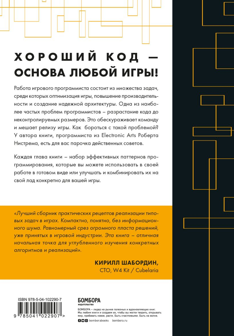 Each chapter of the book is a set of effective programming patterns that you can use off-the-shelf or improve and combine them in your own way for your own game. "The best collection of practical recipes for realizing typical tasks in games. Compact, clear, without information noise. An even cross-section of the huge layer of solutions already adopted in the game industry. This book is an excellent starting point for in-depth study of specific algorithms and implementations." - Kirill Shabordin, CTO, W4 Kit / Cubelaria