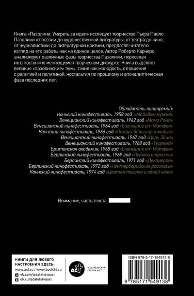 The book "Pasolini. Dying for Ideas" explores the work of Pier Paolo Pasolini from poetry to fiction, from theater to film, from journalism to literary criticism, offering the reader a view of his work as a whole. Author Roberto Carnero analyzes the different phases of Pasolini's work, intersecting them in an ever-changing creative discourse. The book highlights the great "Pasolinian" themes, such as his youth, his relationship with religion and politics, his nostalgia for the past, and the apocalyptic phase of his last years.