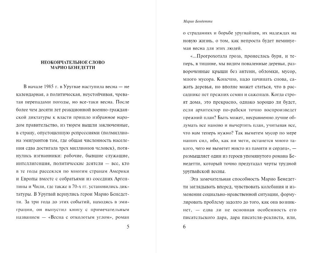 Mario Benedetti stands apart from those who formed the core of the new Latin American novel. Against a backdrop of the fireworks of mythopoetry and magical realism, his everyday, subdued, and fundamentally anti-romantic prose, with its everyday heroes and old-fashioned psychologism, creates an artistic philosophy of history that is the main achievement and contribution of the Latin American novel to 20th-century world culture. Mario Benedetti created his own version of modern realism.