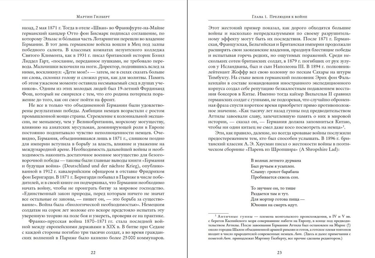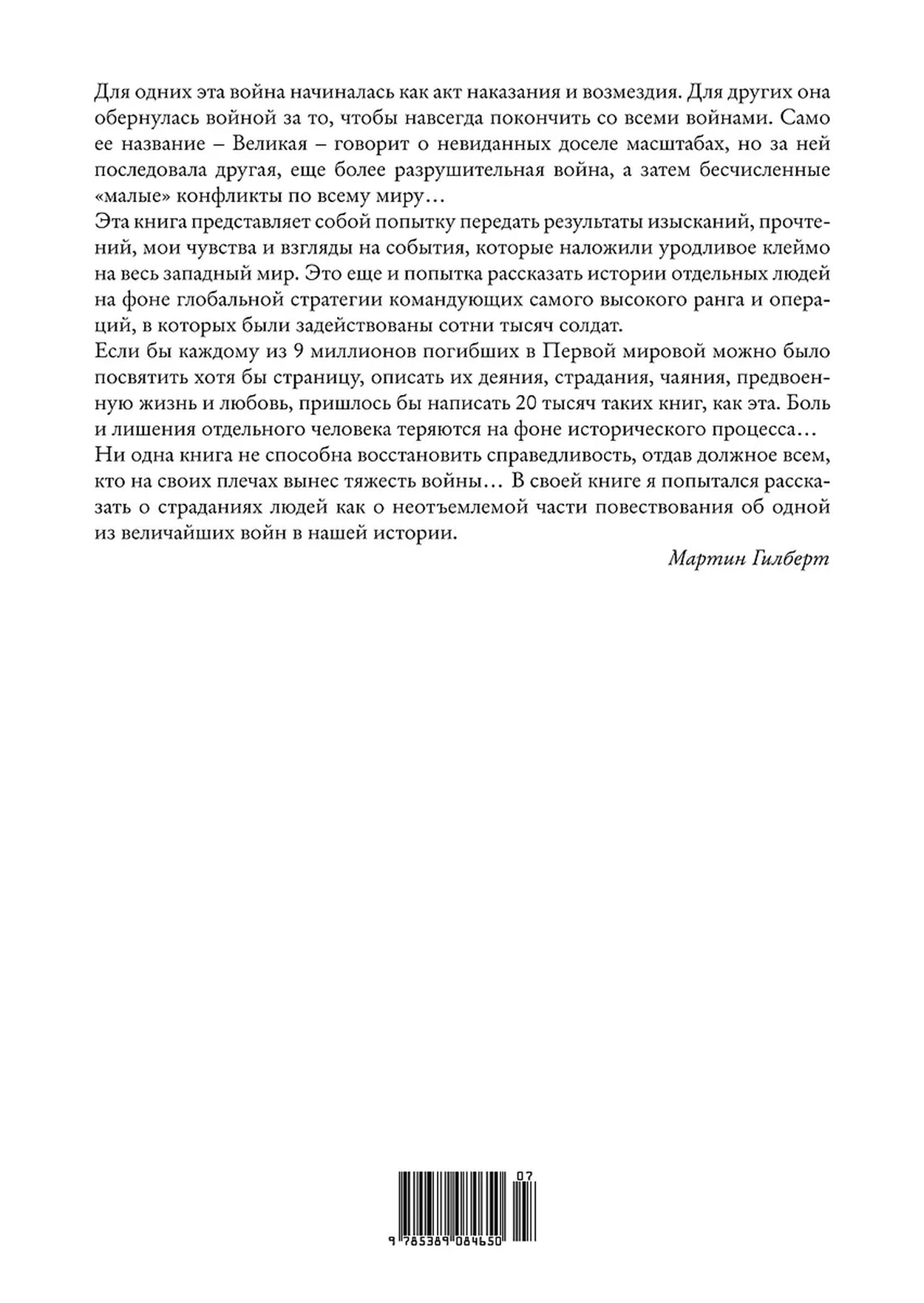 No one wanted this war to begin, but through a confluence of circumstances that may seem random, it was inevitable. The participants in the conflict believed that the war would not last long and would end in complete victory by Christmas 1914, but the armistice was not signed until more than four years later, in November 1918. World War I led to untold suffering and sacrifice on the front lines and on the home front, to epidemics, genocide, the collapse of great empires and revolutions. It changed the fate of the world and redrew its maps. Many hoped that this war, called the Great War, would be the last in history, but it turned out to be the forerunner of the even more devastating World War II. World-renowned British historian Sir Martin Gilbert has written a comprehensive history of the First World War, based on documentary sources, established facts and eyewitness accounts, and has managed to convincingly reveal its causes and outline its consequences. He has succeeded in showing the human cost of a war that claimed and maimed millions of lives through the stories of individual participants, including both heroes and deserters.