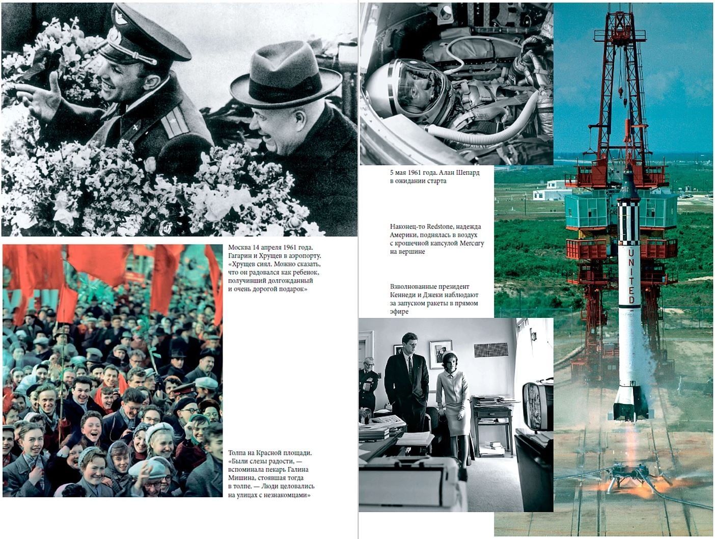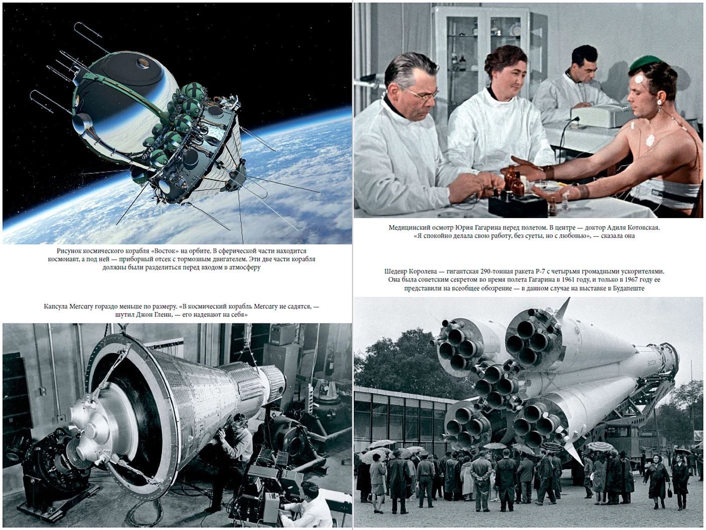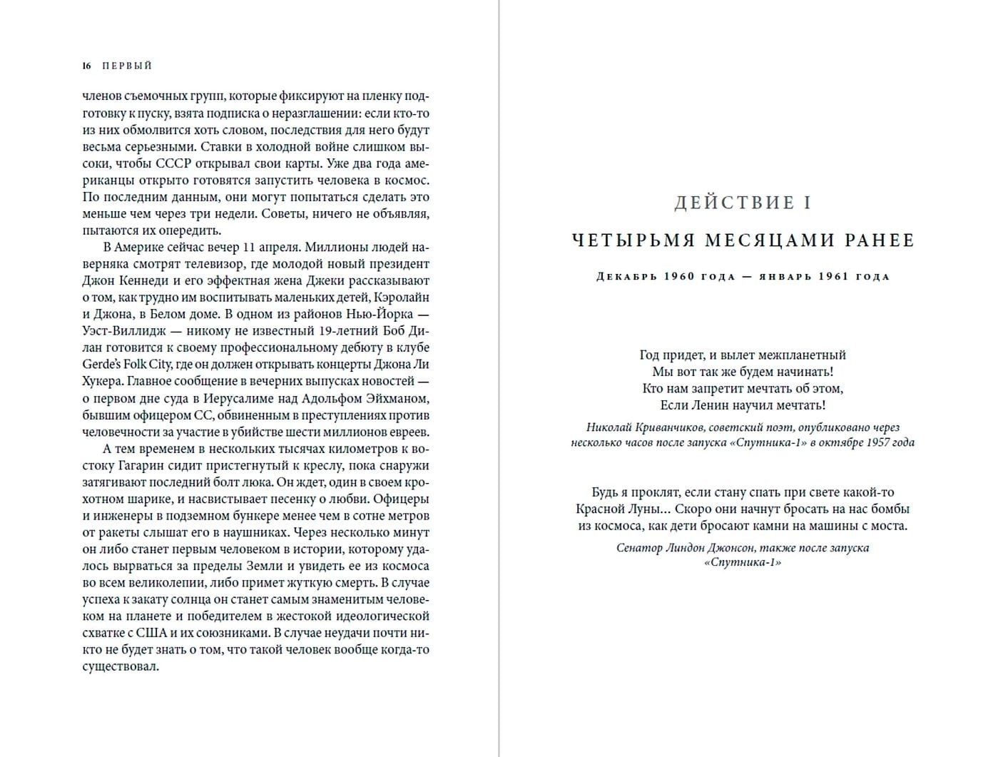 The author draws parallels between Sergei Pavlovich Korolev and Wernher von Braun, the creators of the rockets, as well as Yuri Gagarin and Alan Shepard, the two candidates for the first flight into space. The central place in the narrative is occupied by the story of the first Soviet cosmonaut Yuri Gagarin.