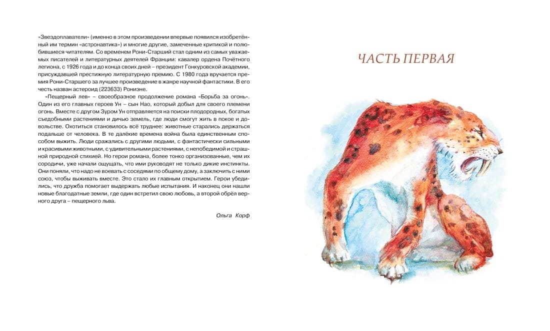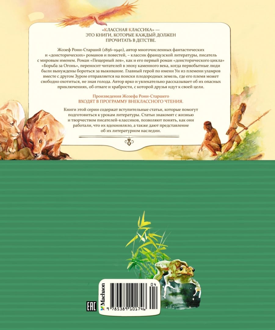"COOL CLASSICS" ARE BOOKS THAT EVERYONE SHOULD READ AS A CHILD. Joseph Rony-Starchy (1856-1940), author of numerous fantasy and "prehistoric" novels and novellas, is a classic of French literature, a writer of international renown. The novel "Cave Lion", as well as his first novel "prehistoric cycle" "Fighting for Fire", takes readers to the Stone Age, when primitive people were forced to fight for survival. The main character named Un from the Ulamr tribe, together with his friend Zur goes in search of fertile land where his tribe can freely hunt without knowing hunger. The author vividly and fascinatingly tells about their dangerous adventures, about the courage and bravery with which the friends go to their goal.